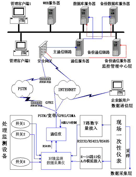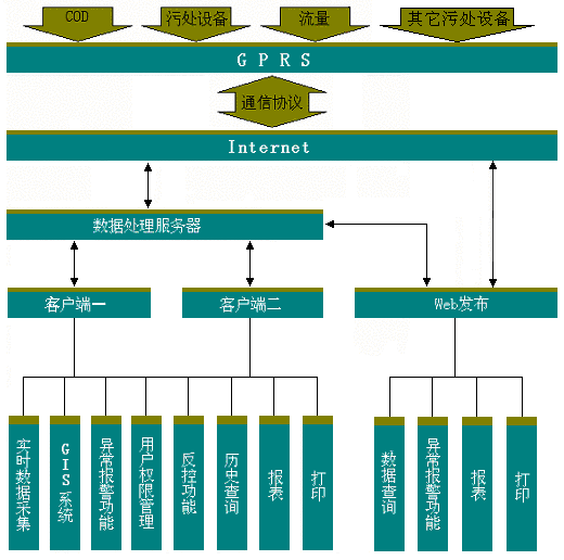 数据传输网络建设依照《环境污染源自动监控信息传输、交换技术规范》(HJ/T 352-2007)设计,统一采集现场端监测设备的数据,通过光纤网络(或无线3G网络)与监控平台对接。